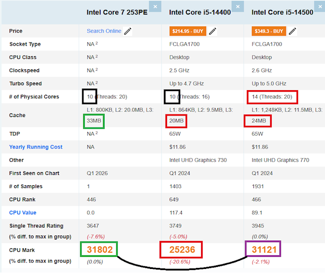 数据显示,拥有10个纯P核的酷睿7 253PE表现出了极高的效率,其多线程得分达到31802分,相比拥有10核心(6P+4E)i5-14400的25236分强了整整26%。