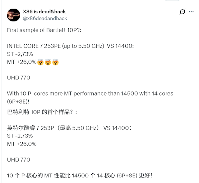 快科技1月18日消息,Intel Bartlett Lake系列处理器采用了纯性能核心(P核)设计,近日其中一款酷睿7 253PE 10核心处理器跑分在PassMark中曝光。